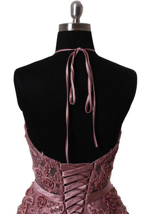 A-line Halter Lace Appliqued Formal Evening Gowns See-through Long Prom Dresses, TYP1193