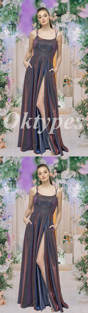 Sexy Shiny Special Fabric Spaghetti Straps Sleeveless Side Slit A-Line Long Prom Dresses With Pocket, PDS0904