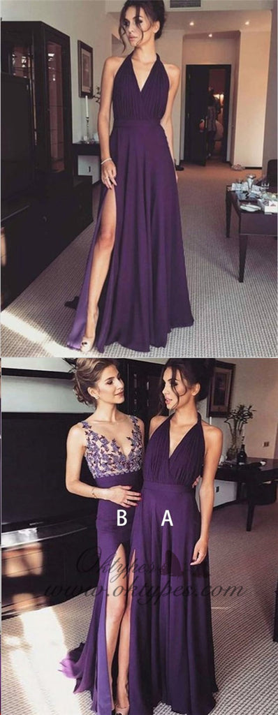 A-Line V-Neck Sleeveless Grape Chiffon Prom Dresses with Split, TYP1331
